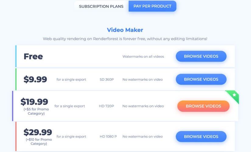 This is the billing model that offers both one-off payments and subscription plans to attract different customer personas. A consumption-based project tool like Renderforest, for example, attracts custom from both professional designers and hobbyists and so offers a range of different billing options to capture the broad spectrum of interested potential customers.