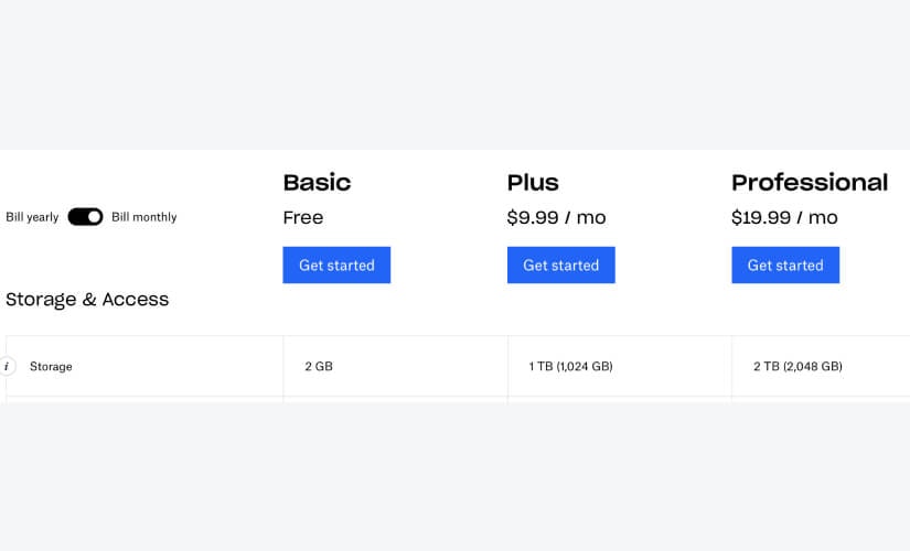 Tiered billing does what it says on the tin; it offers billing options in different tiers, with each tier employing a usage cap. It’s the billing model of choice for consumption-based products and is therefore commonly used by companies selling VPNs, proxy services, and storage.