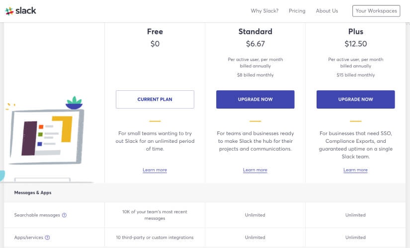 If your customers value the number of people with access to your product or platform, this is a very strong billing model for your business that will see your profit grow as their company scales. Messaging platforms like Slack use the per-seat billing model, presenting their per-seat pricing options in a tiered model on their site to show what their two billing plans offer in comparison to the free, limited version available to small teams.