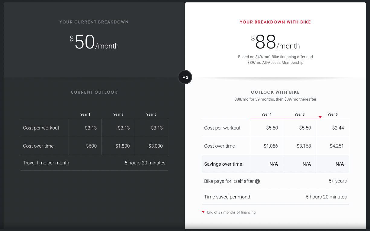 For the customers that aren’t completely sure if buying the Peloton bike or treadmill is for them, Peloton created a comparison calculator to incentivize their customers to move from their current exercise regime to a new one.