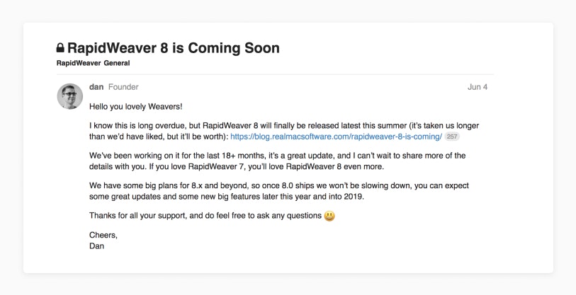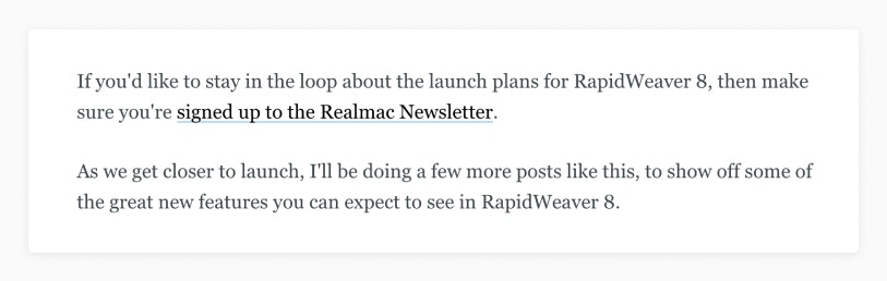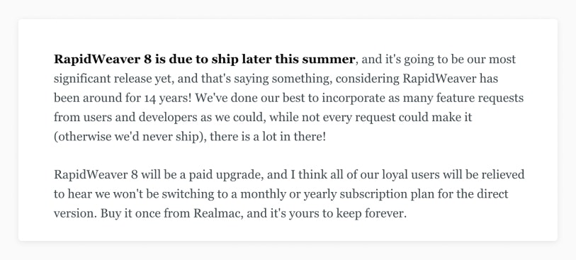 Let's break down Realmac’s announcement of Rapidweaver 8, from the first paragraph they directly addresses their customers. Instead of trying to sell the update straight away, they present a story of how much time and effort they’ve spent on the upgrade. It helps give personality to the app and shows there are human faces behind its development.