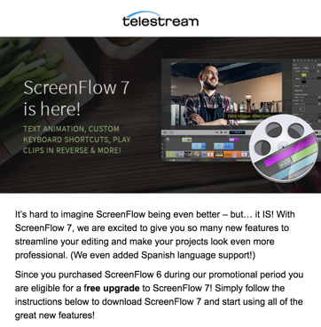This worked well for Screenflow, which offered free upgrades to customers who had purchased a previous version of their product within a specific period of time. Easy work, happy customers.