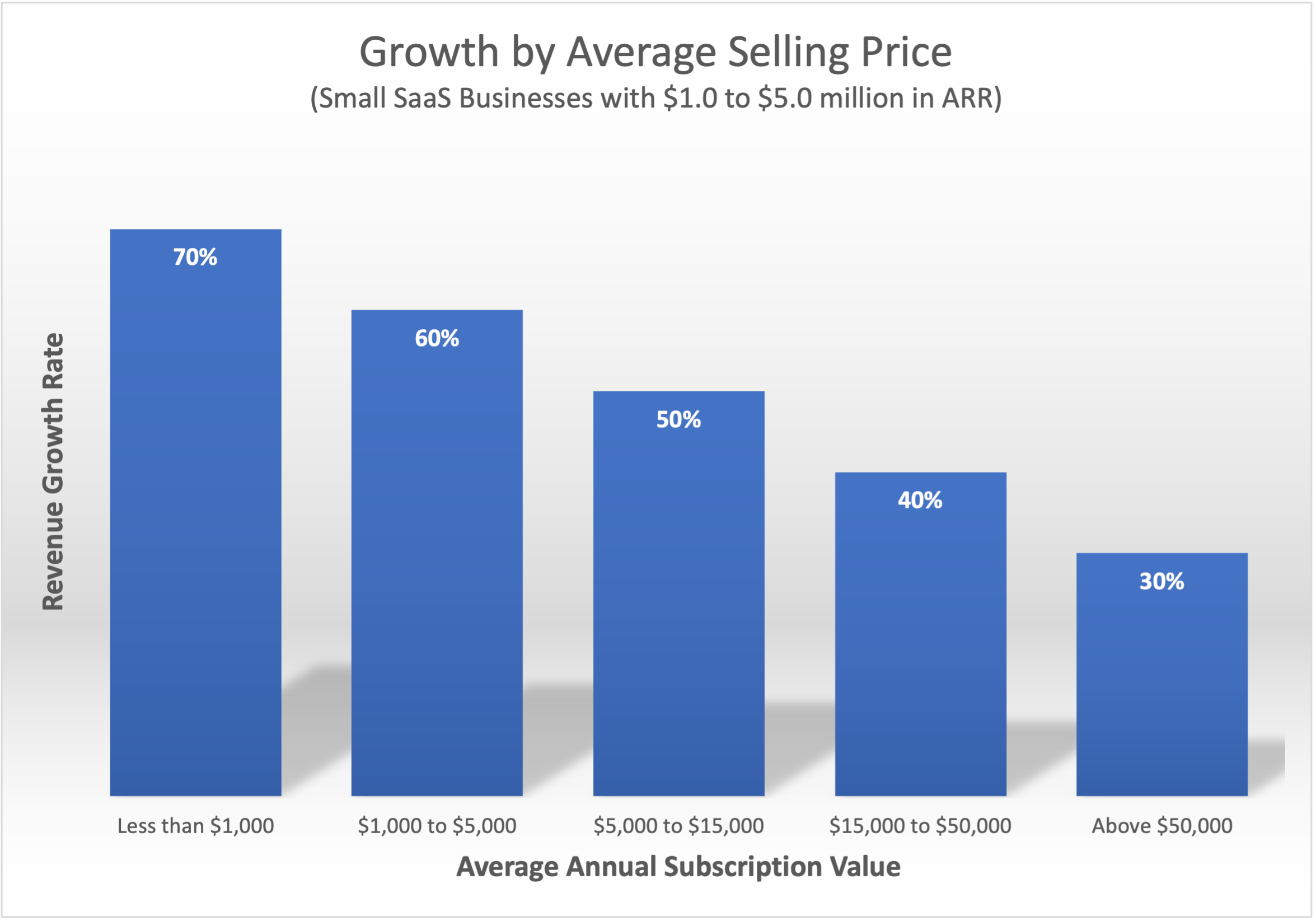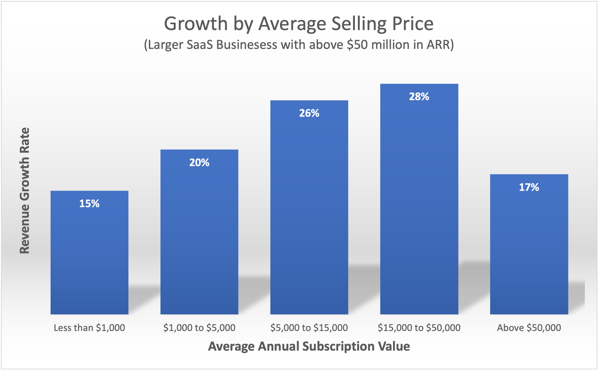 The data support this approach. In the charts below (from SaaS Capital), the growth by average selling price of smaller SaaS businesses are shown, followed by larger businesses. As you can see, the faster-growing small SaaS businesses have lower average selling prices, while the faster-growing large SaaS businesses have larger average selling prices. (This is true except for the last column in the chart which I believe is either the exception that makes the rule or simply noise in the data.)