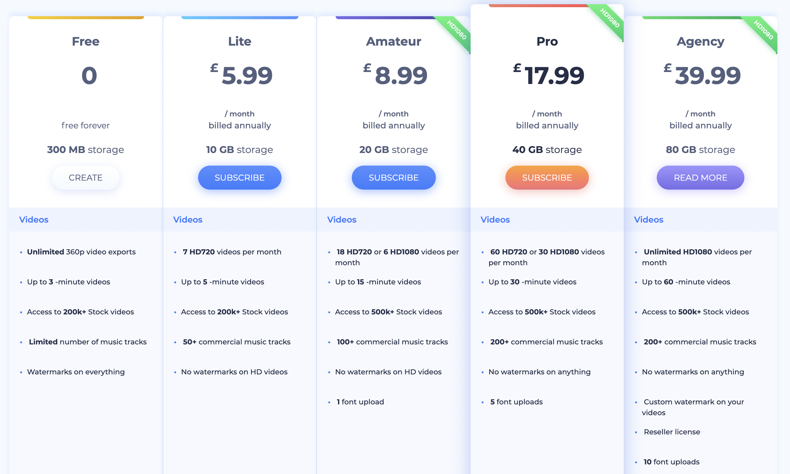 Renderforest is another example of a business that has both a Freemium and a custom option, with the latter aimed at agencies. They’ve also braved a few more options for their tiered pricing - and it works. They play on how their target audiences relate to their product; the different scales and contexts of use, whether that’s professional or personal. Each higher tier includes more storage than the last, while 'Amateur' and above get a greater level of service and quality of video included too.