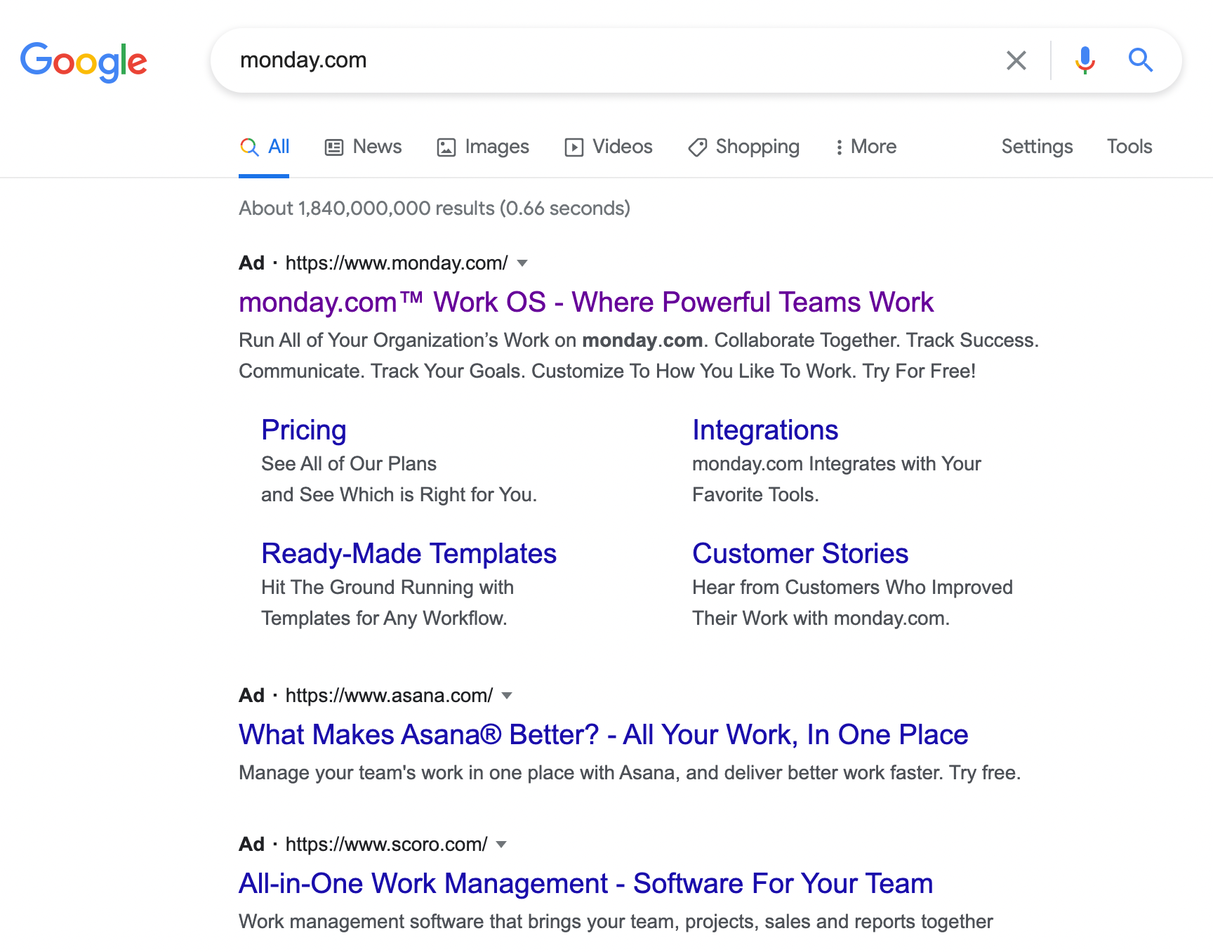 Here you can see Asana and Scoro bidding on Monday.com, and presenting themselves as a clear alternative product.