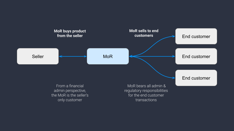 A merchant of record is a term used to describe the legal entity selling goods or services to an end customer. The MoR is who the end customer owes payment to for their purchase, they handle all payments and take on the liability related to each transaction. This includes collecting sales tax, ensuring payment card industry (PCI) compliance, and honoring refunds and chargebacks. Businesses can choose to be their own merchant of record, and set up the infrastructure and processes needed to manage payments and related liabilites. Alternatively, MOR service providers exist to take the burden of payment processing and compliance away from those who prefer to spend their in-house resources on more exciting parts of growing a business, like evolving their product or winning more customers.