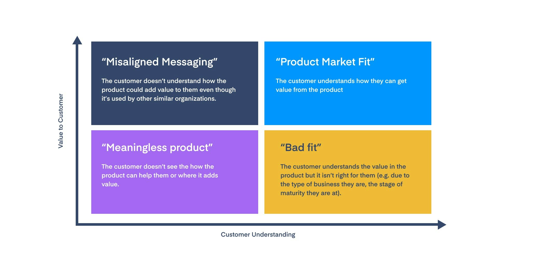 A product-market fit should consider two elements - what customer pains are being addressed, and what outcomes can be expected. This is often called a ‘value proposition’, and it ensures prospects and customers hear a consistent message. For complex products, where there are multiple targets involved in the buying journey, different value propositions should be created for each group or market.