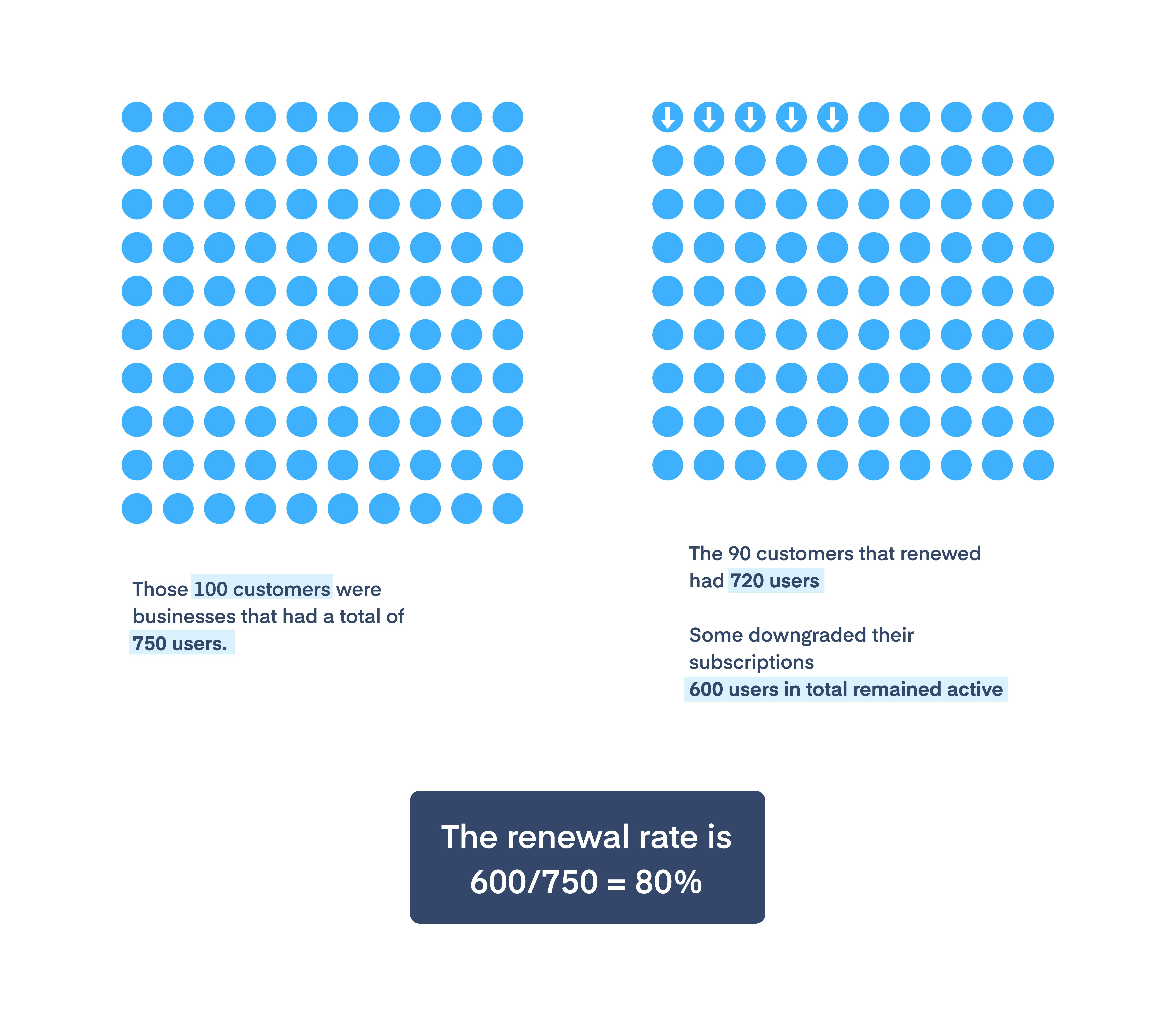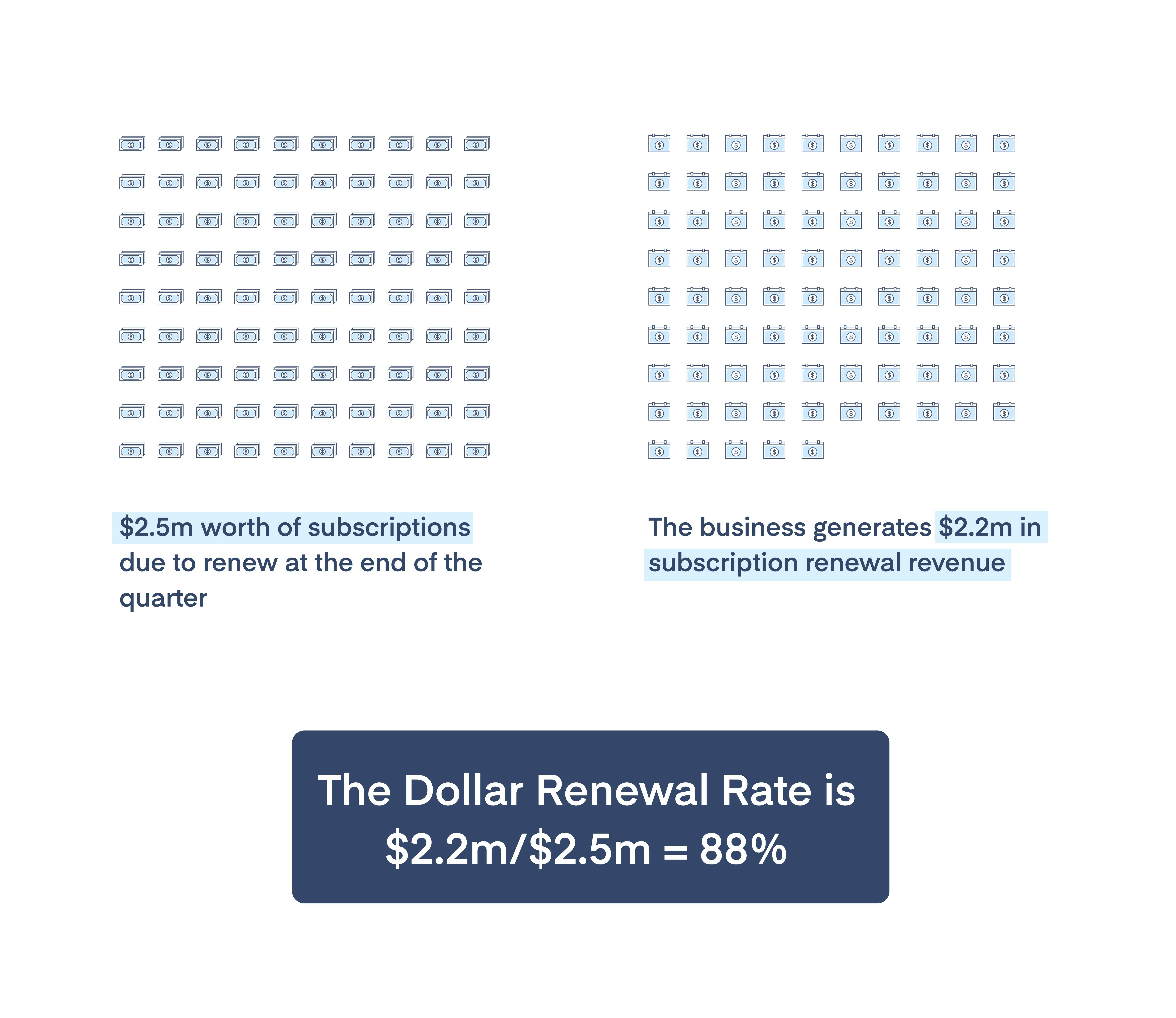 Looking just at customer numbers doesn’t provide the full picture. For that, you also need to calculate renewal rates in monetary terms. We call this ‘dollar renewal rate’.