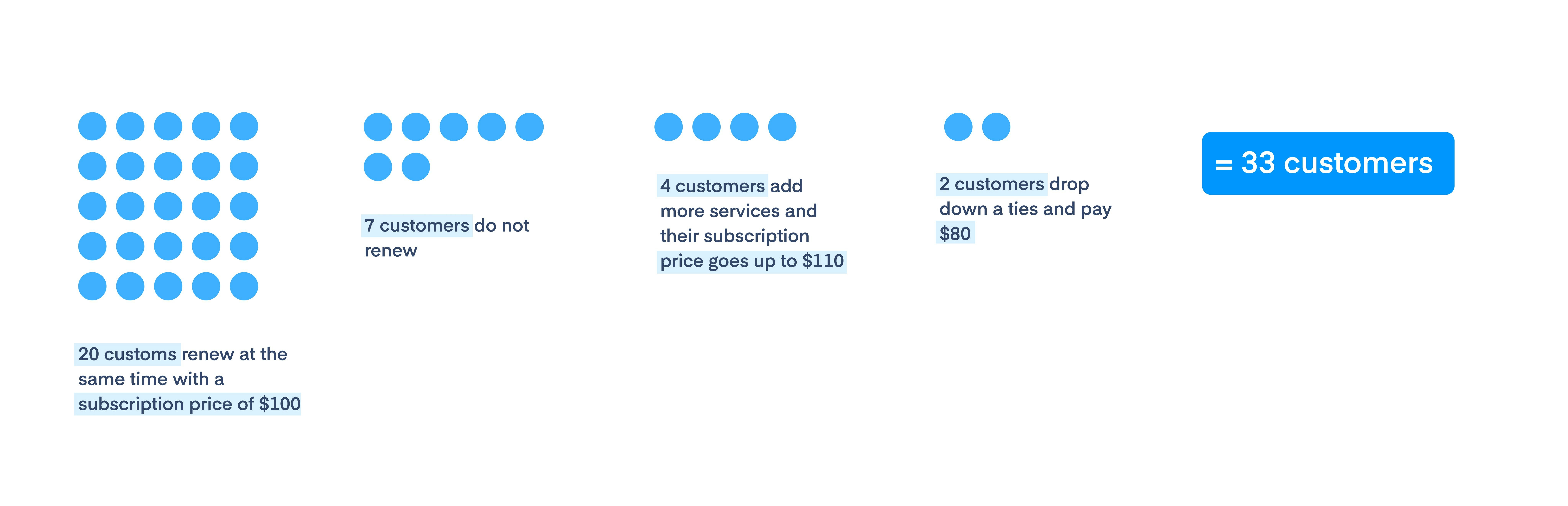 - Actual Dollar Renewal Rate is: (20 customers * $100 = $2000) + (4 customers * $110 = $440) + (2 customers * $80 = $160) = $2,600